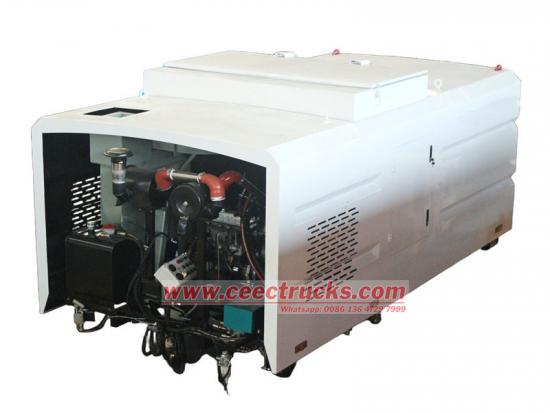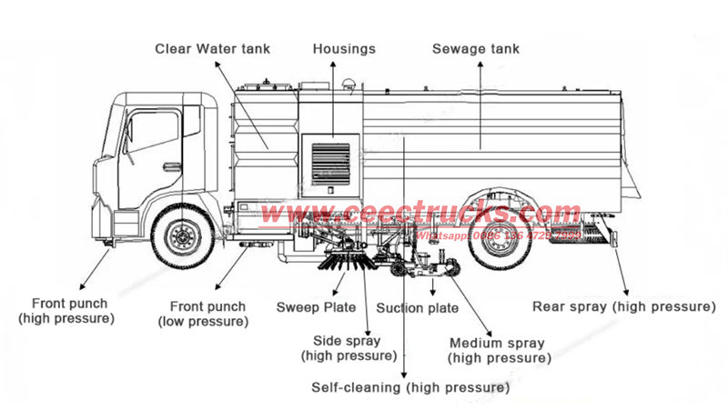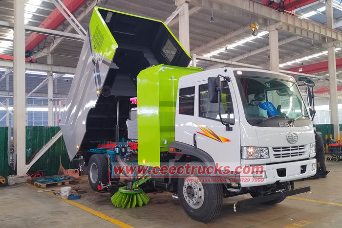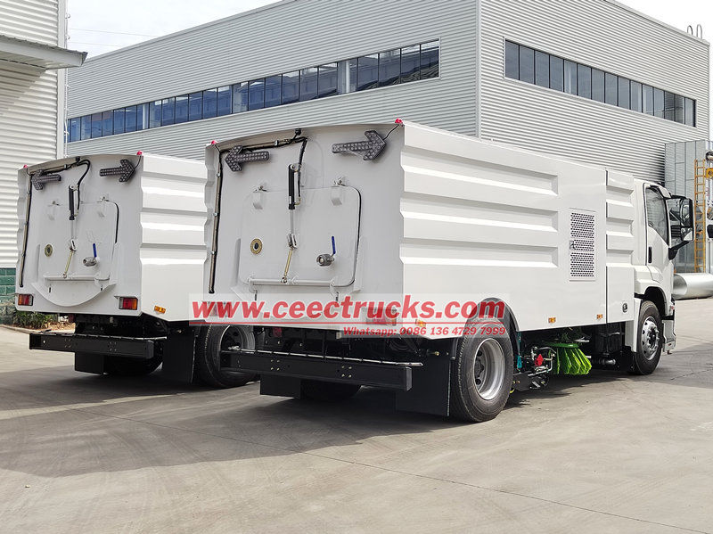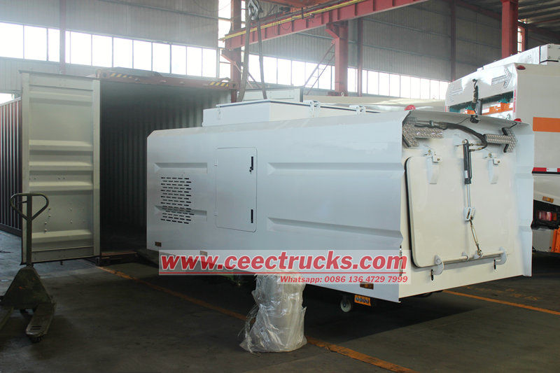 De bovenbouwsets van de 10 CBM veegwagen bestaan uit een afvalbak, een veegmechanisme, een stofafzuigsysteem en een watersproeisysteem. Het rationele ontwerp combineert zuig-, veeg- en sproeifuncties. Het veegmechanisme is gemaakt van zeer slijtvaste materialen en een zeer efficiënte borstelschijf, die zich flexibel aan het wegdek aanpast voor een grondige verwijdering van vuil. Het stofafzuigsysteem, gecombineerd met een ventilator en leidingen, vangt effectief stof en fijne deeltjes op. Het watersproeisysteem vermindert stof en zorgt voor schone lucht.