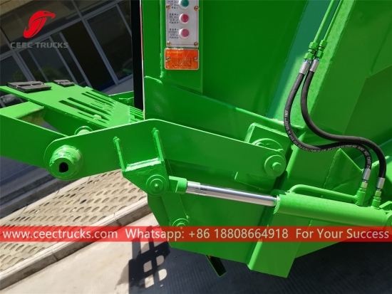 Europese norm 10.000 liter vuilniswagencarrosserie, die gebruikmaakt van een verdichtingscarrosserie van hoogwaardig staal, geïmporteerd PLC-besturingsmodel, hydraulisch cilinderbedieningsapparaat, Engelstalige bedieningskast voor eenvoudige bediening.
