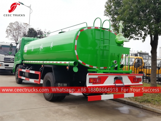 DONGFENG 11.700L watertransportwagen, DONGFENG 4x2 chassis met stuur aan de linkerkant, handgeschakelde zesversnellingsbak, CUMMINS 210 pk dieselmotor, waterpomp van een bekend merk, optioneel met sproeikop voor, midden en achter. Alle lakwerk en logo's zijn naar wens.