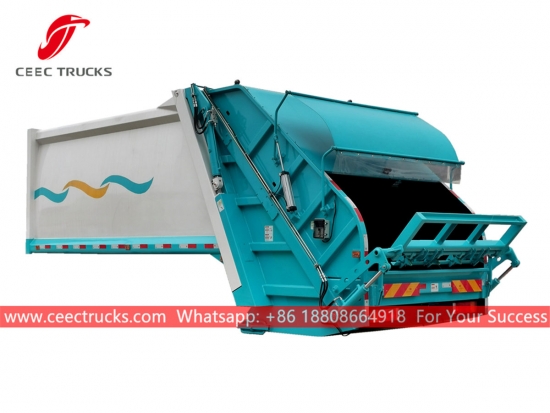 Hoogwaardige 12.000 liter gecomprimeerde vuilniswagencarrosseriestructuur, die gebruikmaakt van hoogwaardig staal voor de verdichting, geïmporteerd PLC-model, bedieningsapparaat voor hydraulische cilinders, bedieningskast in Engelse versie voor eenvoudige bediening.