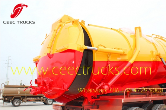 3. Uitrusting: ronde tank met materiaal van koolstofstaal, schoepenvacuümpomp geïmporteerd uit Italië, met hefsysteem, achterdeksel kan worden geopend door hydraulisch apparaat, uitgerust met zelfstromend gat en speciale klep, aanzuigdiepte kan 5-8 meter bereiken, uitgerust met speciale rioolzuigbuis;