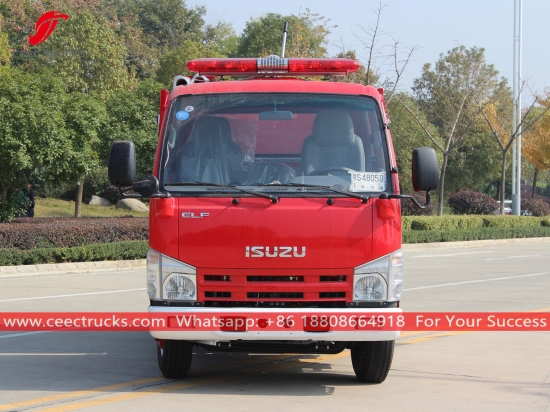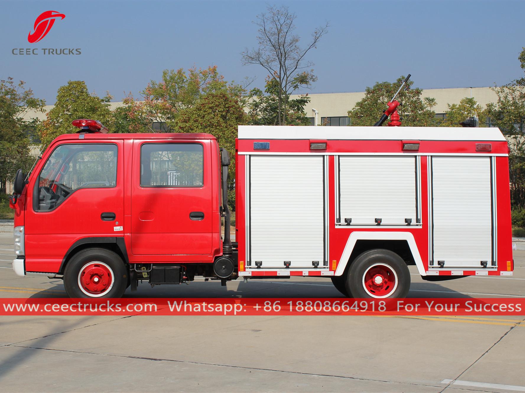ISUZU 2CBM waterbrandweerwagen, uitgerust met een ISUZU 100P linksgestuurd model, 4x2 chassis, handgeschakelde 5-versnellingsbak, ISUZU 98HP dieselmotor, watertankinhoud 2.000 liter, lakwerk en logo's op aanvraag.