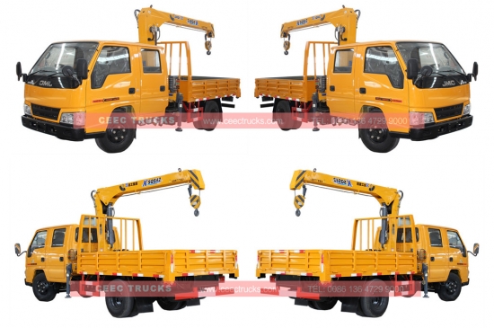 JMC 2T giekkraanwagens te koop, JMC dieselmotor 92 pk, handgeschakelde 5-versnellingsbak te koop, met linksgestuurde of rechtsgestuurde uitvoering als optie. Uitgerust met SK2SQ1Q telescopische giekkraan, maximale hefhoogte 2000 kg. Met afstandsbediening naar keuze.