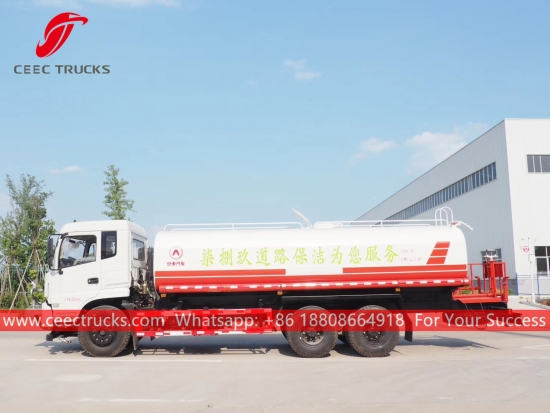 DONGFENG 20.000L waterwagen, DONGFENG 6x4 chassis met stuur links, handgeschakelde 8-versnellingsbak, CUMMINS 210 pk dieselmotor, waterpomp van een bekend merk, met optionele sproeiers voor, midden en achter. Alle lakwerk en logo's zijn naar wens.