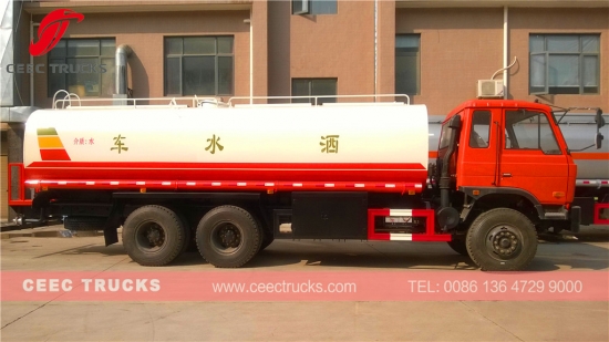 Goedkoopste prijs Dongfeng 20.000 liter watertanker, die gebruik maakt van Dongfeng 6 * 4 chassis, met LHD en RHD opties, CUMMINS 210 pk als standaard dieselmotor, 5900 ml emissie. 8-versnellingsbak met handgeschakelde versnellingsbak voor eenvoudige bediening, 5 mm dik hoogwaardig staal watertankermateriaal verlengt de levensduur van de watertanker, verf en logo's zijn afhankelijk van de aanvraag