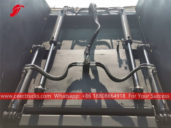 Europese norm 12000 liter vuilniswagen met perslucht, die gebruik maakt van een compacteerbak van hoogwaardig staal, PLC-model met importcontrole, hydraulisch cilinderbedieningsapparaat, bedieningskast in de Engelse versie voor eenvoudige bediening