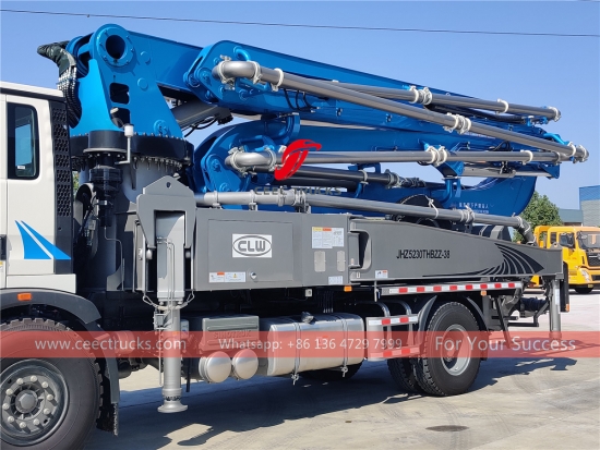 HOWO 38m betonpompwagen voor export naar Afrika, HOWO klassiek 6x4 LHD/RHD chassis, WEICHAI 380pk dieselmotor met euro 3-emissie, FAST handgeschakelde versnellingsbak met 12 versnellingen, beroemde cementpomp met werkhoogte van 38 m, lakwerk en logo's op aanvraag.