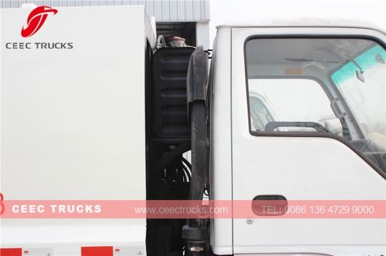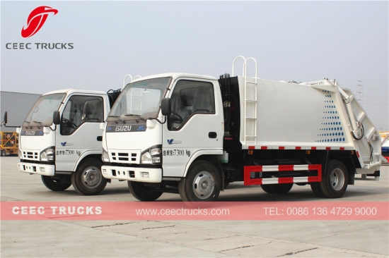 ISUZU 5cbm afvalcompressorwagen, Japanse technologie ISUZU vrachtwagenchassis 4 * 2 model, ISUZU 4KH1-TC 120 pk dieselmotor, MSB 5-versnellingsbak met handgeschakelde versnellingsbak, zoals voor 5000L afvalcompressor tankwagen, die gebruik maakt van hoogwaardig staal, dikte meer dan 5 mm, met elektrisch en hydraulisch bedieningsapparaat voor eenvoudige bediening. Verf en logo's zijn afhankelijk van de aanvraag.
