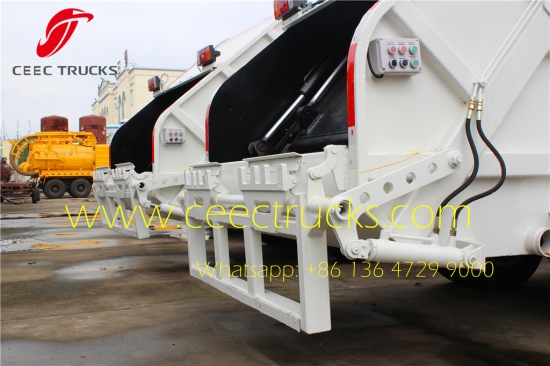 Above show CEEC produced ISUZU 5CBM trash compressor truck Compact System, which mainly consist of Tilting Device (optional for 240L & 360L, 660L & 1100L rubbish bins); Slide Plate; Scraper; Push Plate & Rear Tail Gate. All parts are well-designed, strong structure and light self-weight.