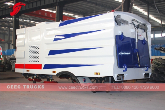 Nieuw ontworpen bovenbouw van een veegmachine uit 2017, uitgerust met een roestvrijstalen materiaaltank van 5 cbm, en beschildering en logo's zijn op aanvraag beschikbaar, die op ISUZU & HINO & MITSUBISH chassis LHD & RHD-modellen kunnen worden gemonteerd