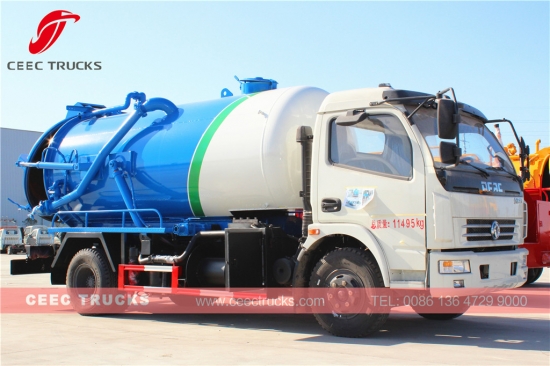 Dongfeng 6000L beerput-leegwagen met lage prijs, die gebruikmaakt van een CHAOCHAI 120 pk dieselmotor, een handgeschakelde 5-versnellingsbak, een tank van hoogwaardig staal met een inhoud tot 6 cbm, standaard een WEILONG vacuümpomp, een hydraulisch hefwerktuig voor afvalafvoer, en schilderwerk en logo's op aanvraag.