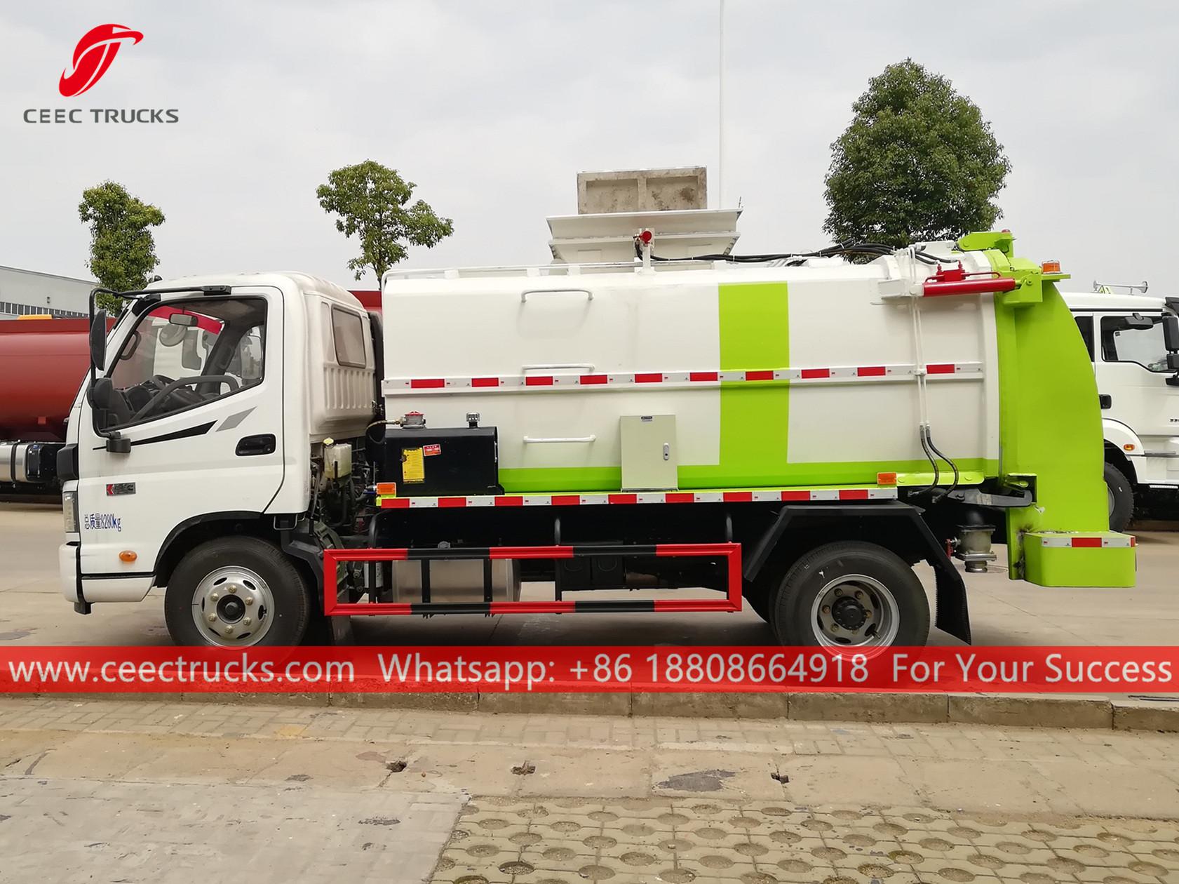 FOTON 6cbm Keukenafvalinzamelwagen, FOTON 4x2 chassis, handgeschakelde 5-versnellingsbak, CUMMINS 142 pk dieselmotor, automatische zijlift, uitgerust met hydraulische achterdeur, lakwerk en logo's op aanvraag.