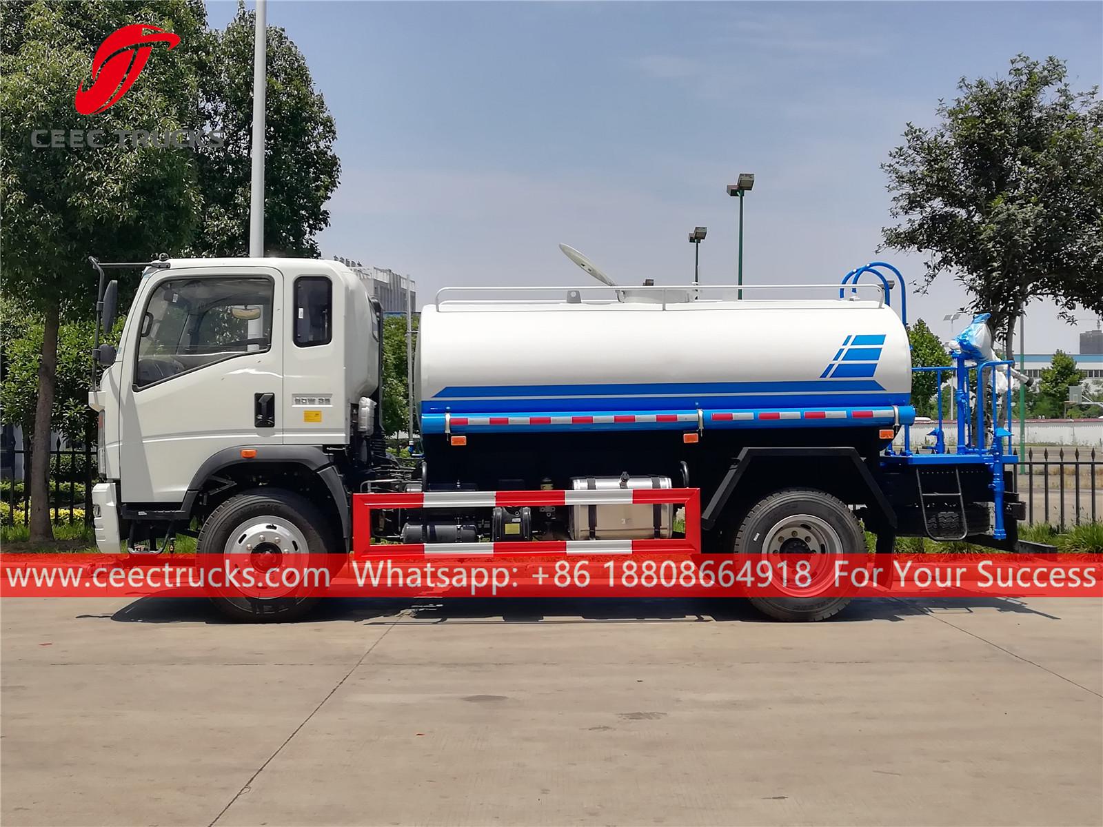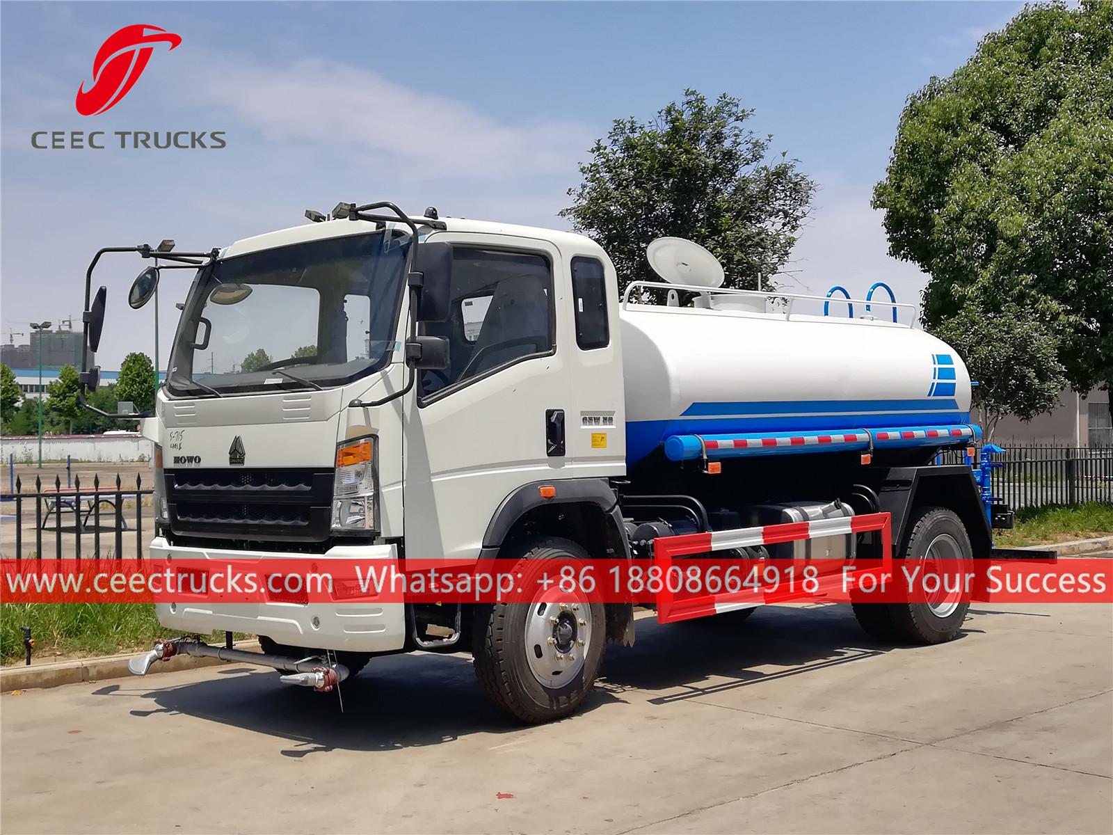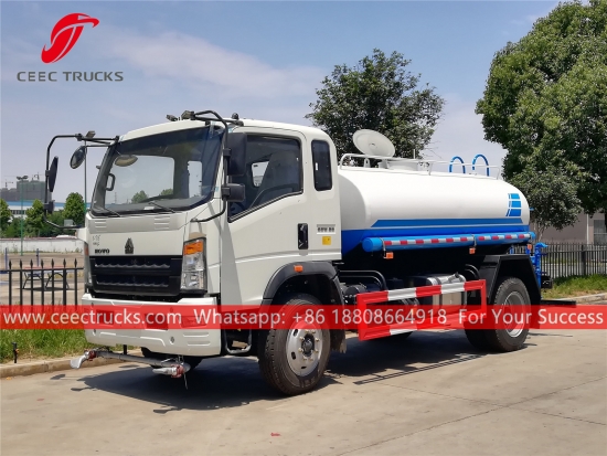 HOWO 8.000L waterspuitwagen, HOWO 4x2 chassis met stuur links, handgeschakelde zesversnellingsbak, SINOTRUK 160 pk dieselmotor, waterpomp van een bekend merk, met optionele sproeiers voor, midden en achter. Alle lakwerk en logo's zijn naar wens aan te passen.