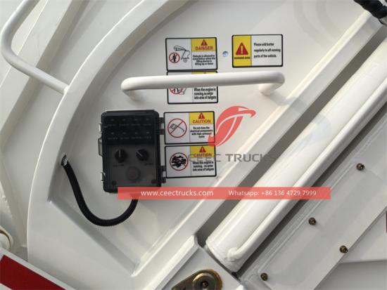 De vuilniswagen maakt gebruik van een elektrohydraulische regelklep en een programmeerbaar PLC-besturingssysteem, dat optimaal gebruikmaakt van de voordelen van elektrische en hydraulische besturing. Door de gecombineerde elektrohydraulische besturing wordt het interfaceprobleem tussen het hydraulische en het elektrische systeem effectief opgelost en de gebruiksbetrouwbaarheid verbeterd.