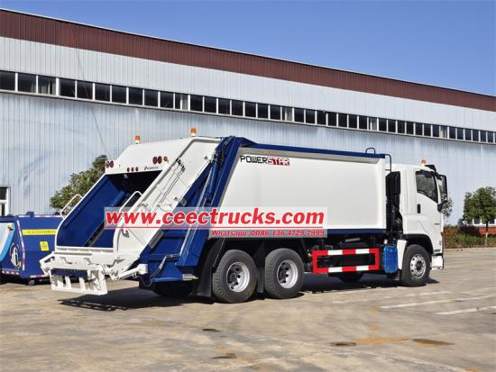 Isuzu VC61 6x4 cabin,large capacity garbage binDeze zware Isuzu GIGA 6x4 vuilniswagen is een uitstekend staaltje werk op het gebied van sanitaire voorzieningen en een strategisch wapen voor stedelijke reiniging. Uitgerust met een 6UZ1-TCG61-motor, levert hij een krachtig vermogen van 380 pk, een cilinderinhoud van 9,839 liter en turbocompressor- en intercoolertechnologie. Hij is niet alleen krachtig, maar voldoet ook aan de strenge Euro 6-emissienormen. Met een totaalgewicht van 25 ton en een laadvermogen van 12,7 ton voldoet hij volledig aan de dagelijkse afvalinzamelingsbehoeften van grote en middelgrote steden.
