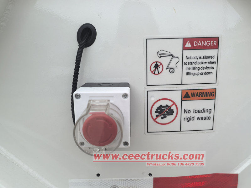 ● Er is een noodstopknop ingebouwd, waarmee het afvalverdichtingsapparaat in elke situatie of op elke locatie onmiddellijk kan worden stopgezet. Zo worden zowel de operator als de apparatuur beschermd.