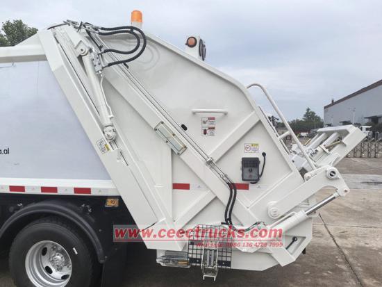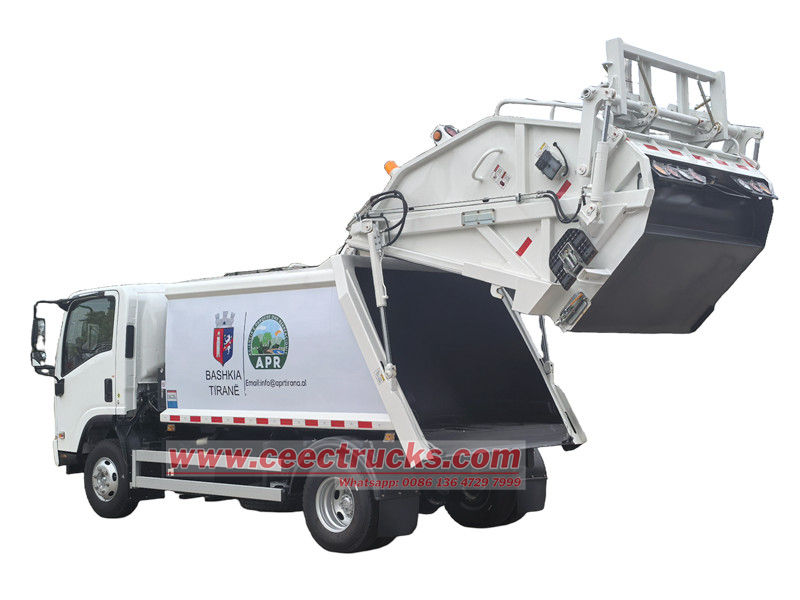 De Isuzu NPR achterlader is een uiterst efficiënt en multifunctioneel reinigingsvoertuig dat voornamelijk wordt gebruikt voor het ophalen, comprimeren en transporteren van stedelijk huishoudelijk afval. Met een wielbasis van 3360 mm, een Isuzu 4KH1CN6LB 120 pk motor, Euro 6 diesel 2.999L emissie, Isuzu MSB 5-versnellingsbak, 700R16 banden met in totaal 7 stuks, airconditioning, USB, richtingaanwijzer en 3 zitplaatsen. De bovenwagen is een vuilnisbak van 10 cbm, de achterkant is een kantelmechanisme voor de bak en er zijn 3 methoden om de vrachtwagen te laden en lossen.