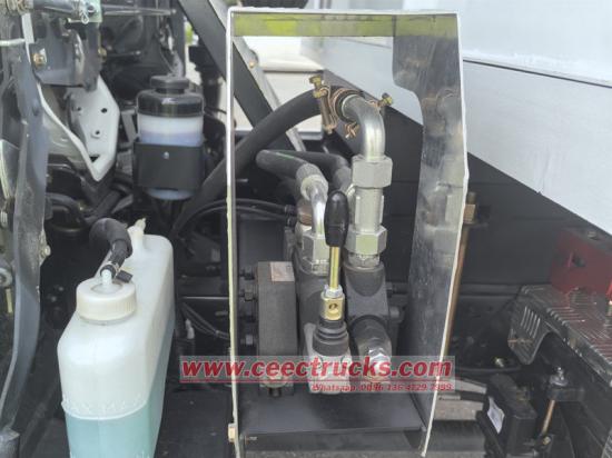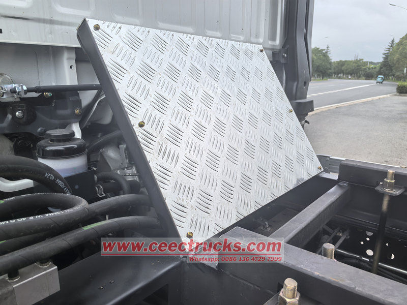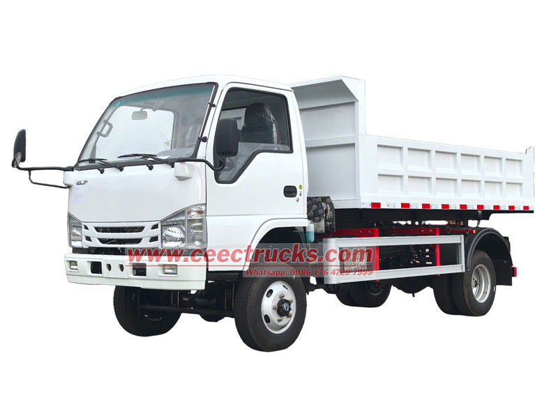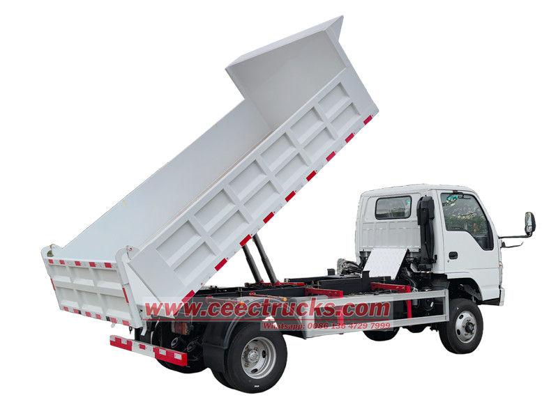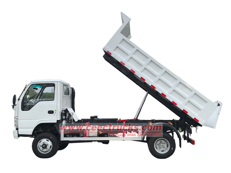 De kleine Isuzu-kiepwagen bestaat hoofdzakelijk uit een chassis, een hydraulisch hefsysteem, een laadbak en een besturingssysteem. De laadbak is gelast met hoogwaardige staalplaten en de achterkant is voorzien van een automatisch vergrendelende haakconstructie voor optimale afdichting tijdens transport. Het hydraulische systeem bestaat uit een oliepomp, een meertraps hydraulische cilinder, een regelklep en een brandstoftank. Het heffen en laten zakken van de laadbak wordt bediend met de joystick in de cabine.