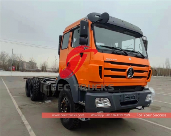 Beiben 2642 vrachtwagenchassis 6*6 aandrijving, militaire kwaliteitsborging, beroemde merk Weichai 420 pk dieselmotor, 12JS200T uiterst betrouwbare transmissie, 4450+1450 mm wielbasis, zwaar uitgevoerd versterkt 4 U-bout ophangingssysteem, Mercedes Benz technologie vooras en achteras, Benz technologie NG80B cabine.