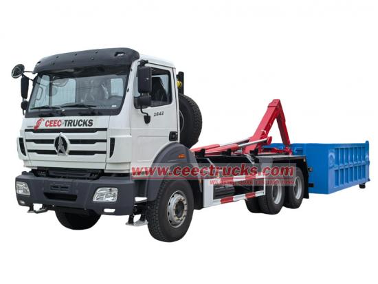 Africa customer purchased Beiben 2642 hook lift garbage truck is a vehicle specially designed to collect and transport municipal solid waste, widely used in city, residence community, factory, hospital, municipal environmental section, garabge transportation station, etc. Beiben 20tons hookloaders is produced based on North Benz 2642 LHD 6x4 truck chassis and equipped with Top 1 Chinese brand WEICHAI diesel engine WP12.420E32 model, 308KW and 420HP, efficiently emission 11596ml, which provides powerful power and stable performance, ensuring excellent performance under various operating conditions, matched working with FAST 12 shift manual transmission gearbox, which are golden partner and can offer much lower fuel consumption. The North Benz 2642 roll off container truck is equipped with 20tons hook loader superstructure, based on Q355 high strength steel material, telescopic hook arm and rear stabilizers for safety loading support. Marched working with multiple garbage containers with size 5600x2300x1500mm, with efficiently loading capacity 19.32CBM, which can quickly and effectively used for garbage collection and long distance transportation.