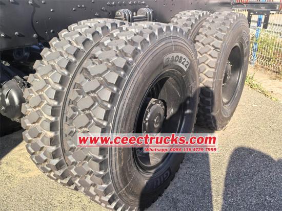 Het Beiben 8x8 vierwielaangedreven chassis levert uitstekende rijeigenschappen bij uiteenlopende en uitdagende wegomstandigheden. De aanloop- en afrijhoek bedragen respectievelijk 33 en 20 graden, aangevuld met een gunstige wielbasis (1500 + 5050 + 1450 mm), waardoor de auto gemakkelijk steile hellingen, diepe geulen en andere complexe terreinen kan trotseren. Bovendien is de auto uitgerust met geavanceerde functies zoals een volledig hydraulisch stuurbekrachtigingssysteem en een dubbelcircuit luchtremsysteem, wat de stabiliteit en veiligheid verder verbetert. Of u nu rijdt op gladde snelwegen of ruige bergwegen, het Beiben 8x8 offroad-chassis levert uitzonderlijke rijeigenschappen.