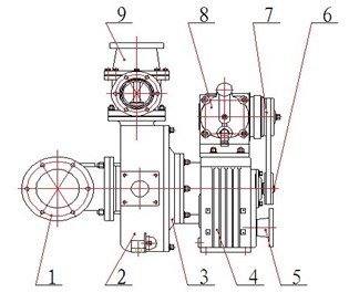 1 Inlaat driewegklep 2 Behuizing 3 Achterdeksel 4 Tandwielkast 5 Askoppelingsflens 6 Riemwiel 7 Elektromagnetische koppeling 8 Zuigerprimerpomp 9 Tegendrukventiel