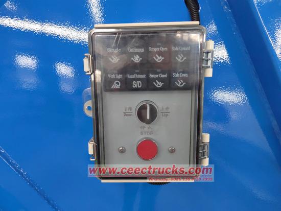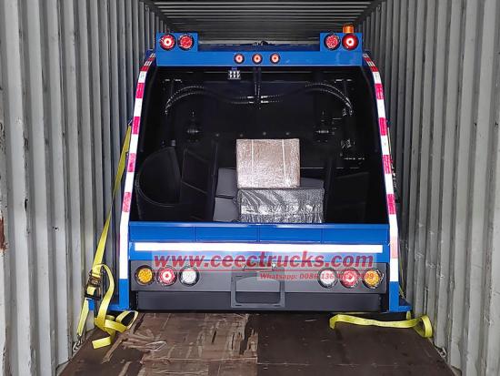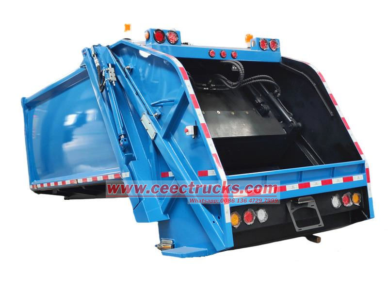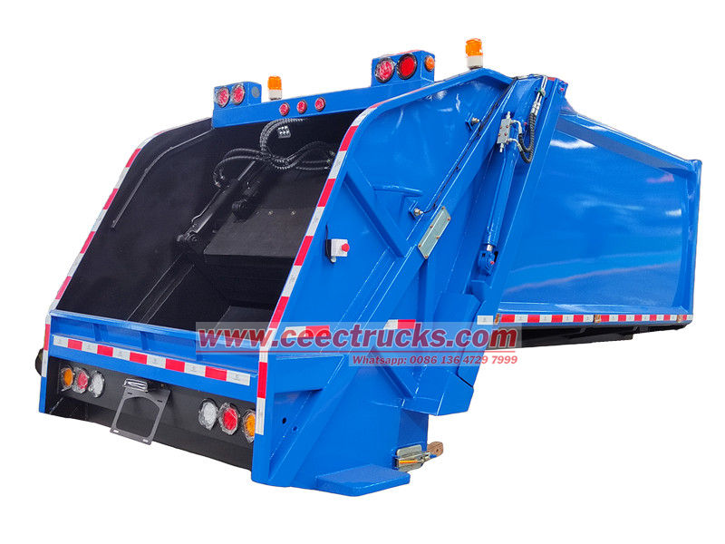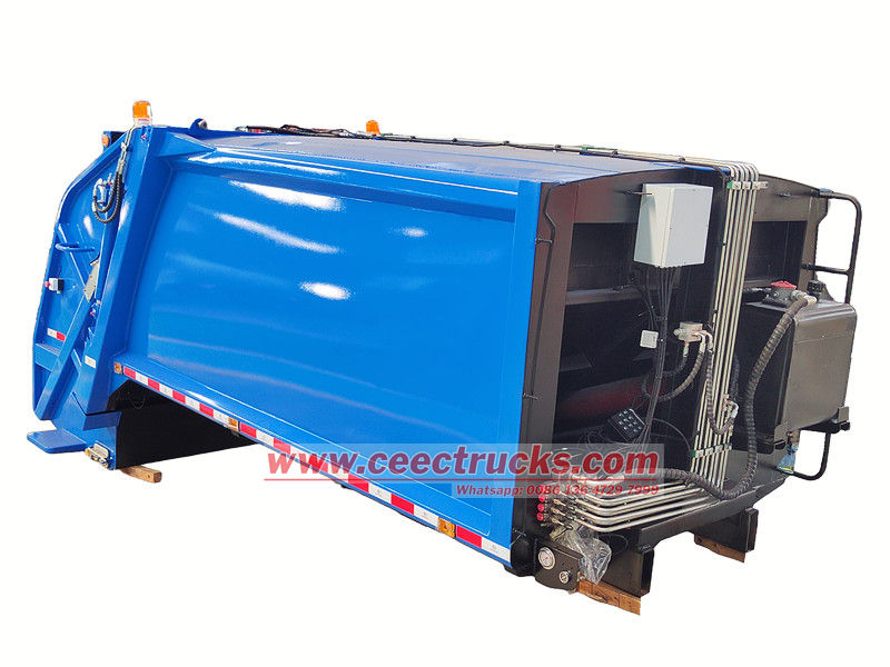 De 10 CBM achterlader bestaat uit een afgesloten compartiment, een duwblad, een lader, een hydraulisch systeem en een elektronisch besturingssysteem. Het compartiment bestaat uit versterkte balken die aan stalen platen zijn gelast, met interne geleidingsrails voor het schuifblad om te lossen. Een hydraulisch systeem regelt de beweging van elke cilinder, terwijl het elektronische besturingssysteem geautomatiseerde bediening mogelijk maakt. Dit zorgt voor een efficiënte en afgesloten werking gedurende het gehele proces van afvalinzameling, -compressie en -transport, waardoor secundaire verontreiniging wordt voorkomen.