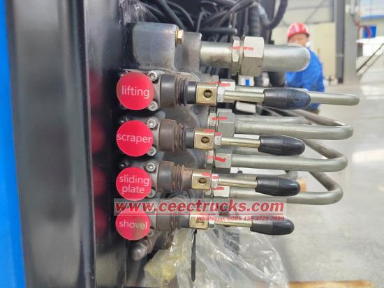 ● Door gebruik te maken van een nauwkeurig hydraulisch systeem en een intelligente elektronische regelmodule wordt een nauwkeurige coördinatie tussen de schraper- en duwbladen bereikt, waardoor de compressieverhouding wordt verbeterd;