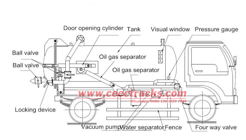 ● De tankwagen met zuigsysteem voor afvalwater werkt door een vacuümpomp in werking te stellen. Hierdoor ontstaat een hoog vacuüm en een negatieve druk in de tank. Hierdoor ontstaat een krachtige zuigkracht die afvalwater, slib en onzuiverheden snel in de tank zuigt.