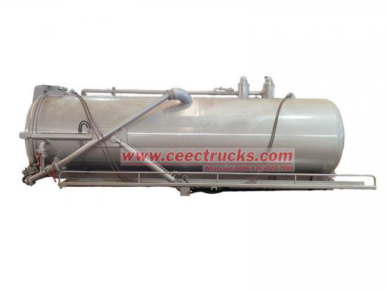 Op maat gemaakte 3000 gallons rioolwaterzuigtankwagenopbouw (ook wel slibvacuümpomp tankwagenopbouw genoemd, 12cbm vacuümzuigpompwagenset, bovenbouwset voor rioolwaterzuigwagen, 3000 gallons kolkenzuiger vacuümwagenbovenbouw, bovenbouw voor rioolwatertankwagen) Wordt op een chassis gemonteerd om vloeistoffen zoals vuil water, slib, septische tanks en ruwe olie te reinigen en op te vangen. Geschikt voor het reinigen van riolen, beerputten, beerputten, kolken, enz. Het wordt veel gebruikt in de milieu- en sanitaire sector.
