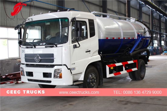 Dongfeng 10.000L beerputlediger, YUCHAI 160 pk dieselmotor, handgeschakelde zesversnellingsbak, tankwagen van hoogwaardig staal met een inhoud tot 10 m3, WEILONG vacuümpomp, hydraulisch hefwerktuig voor afvalafvoer, schilderwerk en logo's op aanvraag.