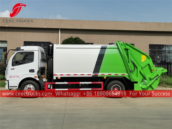 Dongfeng 6cbm afvalperswagen, het chassis is voorzien van een Yuchai 130 pk dieselmotor en een 5-versnellingsbak. Siemens PLC-besturingskast voor eenvoudige bediening. Alle lakwerk en logo's zijn naar wens van de klant.