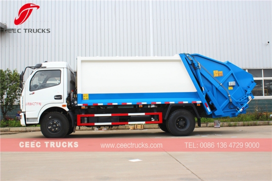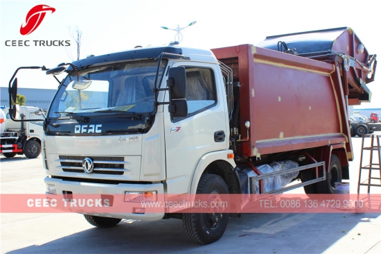 Dongfeng 8000L afvalperswagen, die gebruikmaakt van een CHAOCHAI 120pk dieselmotor, een handgeschakelde 5-versnellingsbak, een afvalperswagen van hoogwaardig staal met een inhoud tot 8 cbm, eenvoudige bediening door Duitse PLC, lakwerk en logo's op aanvraag.