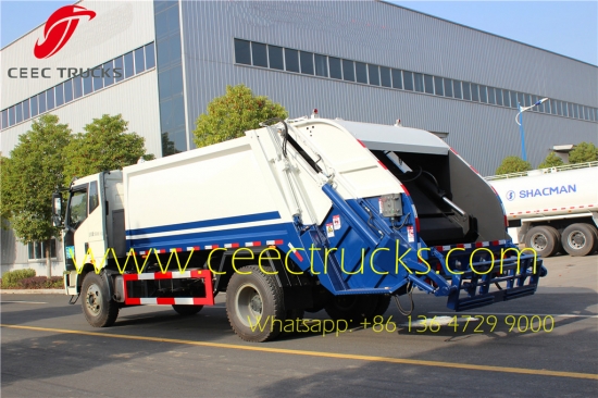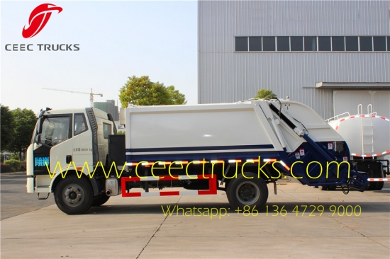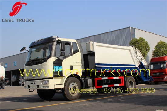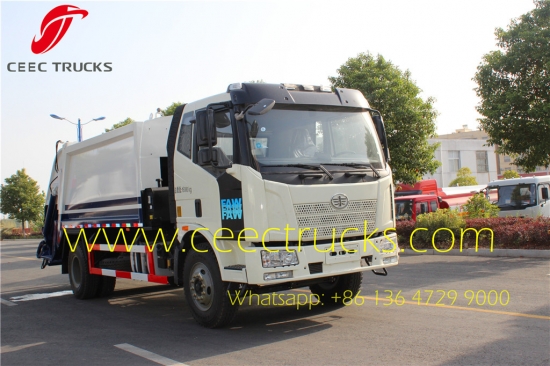 FAW merk 10 CBM afvalperswagens export Afrika, 4*2 aandrijfmodel, 165 pk motor met Euro 3-emissie, 6+1 banden, koolstofstalen Q235 materiaalperswagen met een capaciteit van 10 CBM
