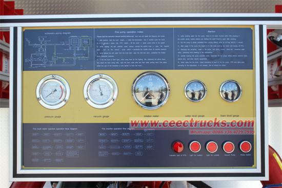 ●Bedieningspaneel:geïntegreerde toerenteller (bewaakt het motortoerental), vacuümmeter (detecteert het vacuüm in de pomp), drukmeter (geeft de waterdruk in realtime weer), schuimniveaumeter (geeft de resterende hoeveelheid schuimvloeistof weer), waterniveaumeter (geeft het waterniveau van de watertank weer).