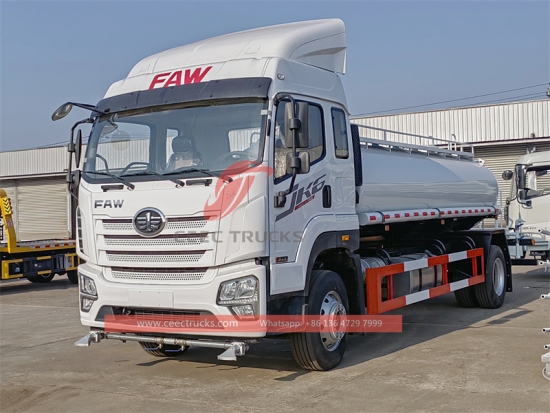 FAW 12.000L watertankwagen, FAW 4x2 J6K chassis, handgeschakelde zesversnellingsbak, WEICHAI 160 pk dieselmotor, waterpomp van een bekend merk, hoogwaardige stalen watertankwagen en leidingen. Alle lakwerk en logo's zijn naar wens.