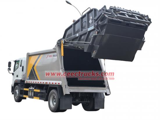 Rear tilting device for 360L and 1100L metal binsDe FOTON 16CBM afvalperswagen is een supersterk ontworpen afvalverwerkingsmachine, gebaseerd op het 1086VLPHK-0FDA01 model 4x2 vrachtwagenchassis. FOTON AUMAN achterlader vrachtwagen is uitgerust met een CUMMINS merk ISDe270 30 model 270HP dieselmotor, en het aandrijfsysteem is uitgerust met turbo- en intercoolingtechnologie, emissie 6700cc, sterker en krachtiger voor bergbeklimmen. Gecombineerd met ZF 8-versnellingsbak, vooras 4,2 ton en achteras 9 ton, geïnstalleerd met 295/80R22.5 banden, wat zorgt voor een sterk draagvermogen. Gemonteerd met 16cbm verdichtingscarrosserie, gebogen vorm gebaseerd op T420-materiaal, dikte voor zijkant 4 mm en vloer 5 mm, uitgerust met dubbele wegbalansklep en opto-elektronische schakelaar voor veiligheid, kantelinrichting aan de achterzijde worden gebruikt voor het laden van 360L en 1100L vuilnisbakken, geschikt voor lokale vuilnisinzameling en transport in de gemeenschap en fabriek. CAN BUS elektrisch besturingssysteem en hydraulisch klepbesturingssysteem werken samen om de FOTON 16000L afvalverwerkingsvoertuig zeer populair en betrouwbaar te maken Chileense hoofdstad Santiago.