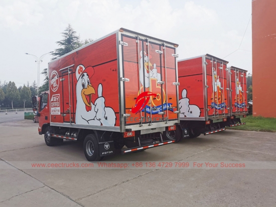 FOTON 4-tons vrieswagen, FOTON rechtsgestuurd model 4×2 chassis, handgeschakelde zesversnellingsbak, CUMMINS 141 pk motor. Uitgerust met Amerikaanse THERMO KING koelunits voor hoge prestaties. De capaciteit van de bestelwagen kan optioneel worden uitgebreid met 3-25 ton.