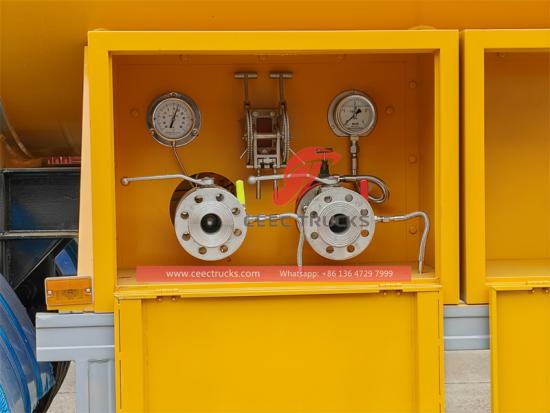 3 assen met BPW-brug (13T), 12R22.5 12PR (13 stuks), JOST-kingpin, JOST-poot (25T), mechanische vloeistofniveaumeters, dubbele drukmeter, dubbele thermometer, dubbele noodsnijklep, vierkogelkraan, dubbele veiligheidsklep, twee gereedschapskisten, enkele uitlaat, dubbel laad- en lossysteem, aluminium zonnekapbescherming, 2 sets 9 kg brandblussers type ABC, 1 set 2 kg brandblusser type CO2, 3 sets gevaarsbord, 2 sets oranje nummerplaten, flowmeter met printer |