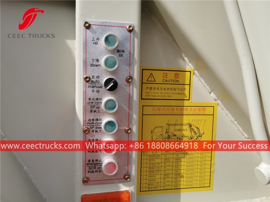 Nieuw ontworpen 8.000 liter achterlader vuilniswagencarrosserie, die gebruikmaakt van een verdichtingscarrosserie van hoogwaardig staal, geïmporteerd PLC-besturingsmodel, bedieningsapparaat voor hydraulische cilinders, Engelstalige bedieningskast voor eenvoudige bediening.