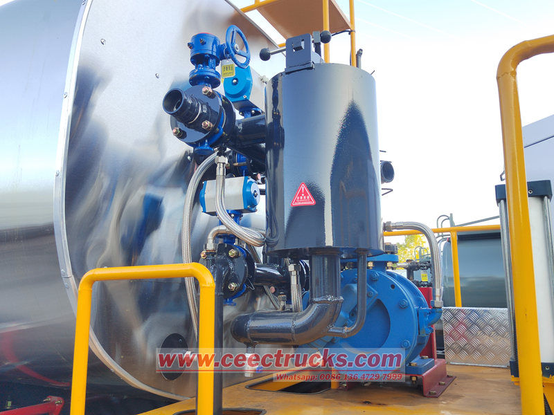 ● Asfaltopslagtank: De Howo Asphalt Spreader-wagen is uitgerust met een grote asfalttank voor de opslag van asfalt. Asfalt is een viskeuze, olieachtige substantie die wordt verkregen door de verwerking van aardolie.