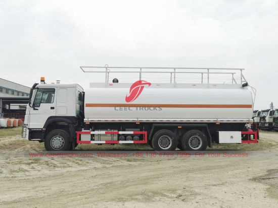 HOWO 20.000 liter brandstoftransportwagen te koop, HOWO 6x4 LHD-chassis, handgeschakelde 10-versnellingsbak, WEICHAI 371 pk dieselmotor, standaard brandstoftanker en standaard een brandstofpomp van een bekend merk. Alle lakwerk en logo's zijn naar wens aan te passen.
