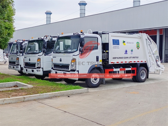 HOWO 10cbm afvalperswagen, het chassis is voorzien van een YUCHAI 140 pk dieselmotor en een handgeschakelde zesversnellingsbak. PLC-bedieningskast voor eenvoudige bediening. Alle lak en logo's worden naar wens van de klant geleverd.