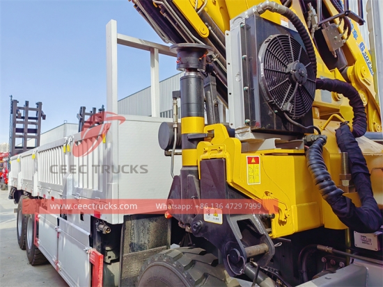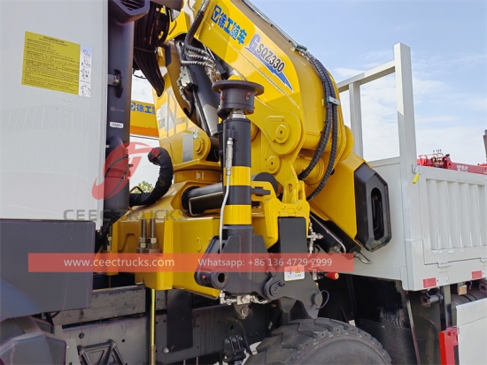 HOWO 25-tons kniklaadkraan, HOWO 8x4 LHD-chassis, SINOTRUK handgeschakelde versnellingsbak met 12 versnellingen, beroemde Chinese SINOTRUK dieselmotor van 400 pk, laadbak van hoogwaardig staal, optioneel met hydraulische lift van Hyva of eigen merk. Alle lakwerk en logo's zijn naar wens.