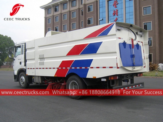 HOWO 12cbm straatveegwagen, HOWO 4x2 chassis, handgeschakelde zesversnellingsbak, 210 pk dieselmotor, roestvrijstalen stofbak en schoonwatertank, 2 borstelsysteem met wassysteem, elektrische cabinebediening voor comfortabele bediening. Alle lakwerk en logo's zijn naar wens aan te passen.