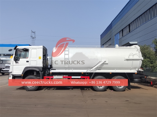 Howo 6×4 18.000L vacuümvuilwaterwagen voor export naar Afrika, WEICHAI 371 pk dieselmotor, ZF 8-versnellingsbak, tankwagen van hoogwaardig koolstofstaal, capaciteit variërend van 16.000 tot 25.000 liter. De beroemde Chinese WEILONG vacuümpomp en geïmporteerde JUROP / BP / MORO vacuümpomp zijn optioneel, hydraulisch hefmechanisme voor afvalafvoer, lakwerk en logo's op aanvraag.