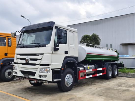 HOWO HW76, NX cabin is optionalDe HOWO 6×4 Water Truck is een multifunctioneel, groen sanitair voertuig, aangepast op het SINOTRUK HOWO ZZ1257 6×4 chassis. Hij is uitgerust met een koolstofstalen watertank van 20.000 liter, een 80QZ60/90-type waterpomp en een sproeisysteem. Het voertuig werkt door middel van de ingebouwde pomp om zelf water uit externe bronnen aan te zuigen en dit vervolgens onder druk te transporteren naar de sproeiers aan de voor-, achter- en zijkant en een waterkanon met een bereik van ≥ 35 meter, waardoor verschillende sproeistanden mogelijk zijn.