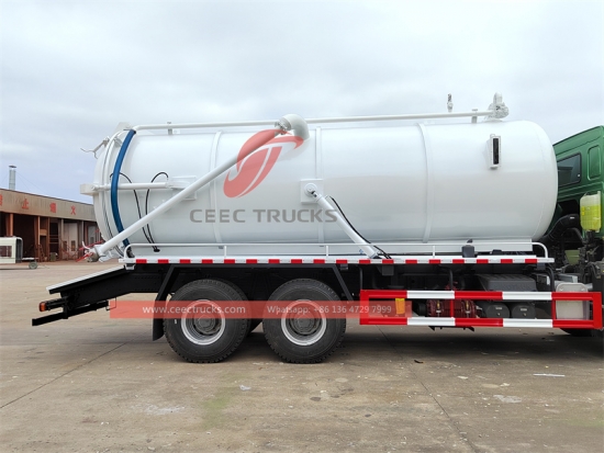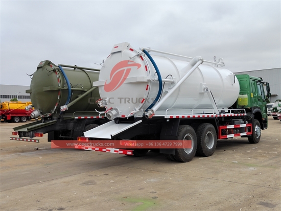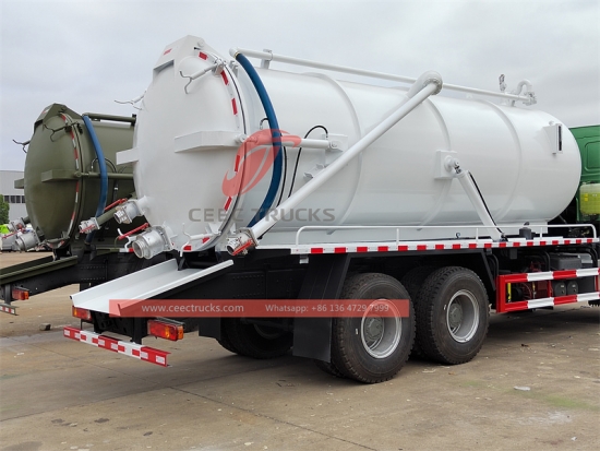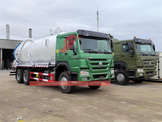400 pk HOWO 20.000L vacuümvuilwaterwagen voor export naar Afrika, WEICHAI 400 pk dieselmotor, HW19710 handgeschakelde 10-versnellingsbak, tankwagen van hoogwaardig koolstofstaal, capaciteit variërend van 16.000 tot 20.000 liter. De beroemde Chinese WEILONG vacuümpomp en geïmporteerde JUROP / BP / MORO vacuümpomp zijn optioneel, hydraulisch hefmechanisme voor afvalafvoer, lakwerk en logo's op aanvraag.