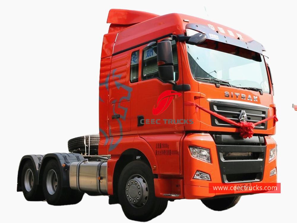 SINOTRUK HOWO 6x4 trekker, SINOTRUK 371pk dieselmotor, handgeschakelde 10-versnellingsbak, maximaal trekgewicht 40.000 kg, lakwerk en logo's op aanvraag.