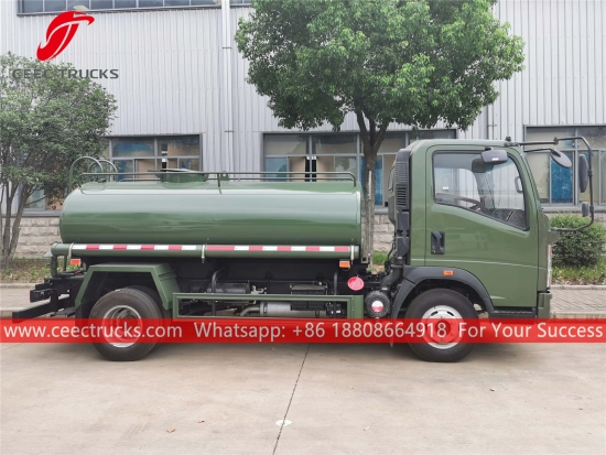 HOWO 3.000L waterspuitwagen, HOWO 4x2 chassis met stuur links, handgeschakelde 5-versnellingsbak, YUNNEI 95 pk dieselmotor, waterpomp van een bekend merk, met optionele sproeiers voor, midden en achter. Alle lakwerk en logo's zijn naar wens aan te passen.